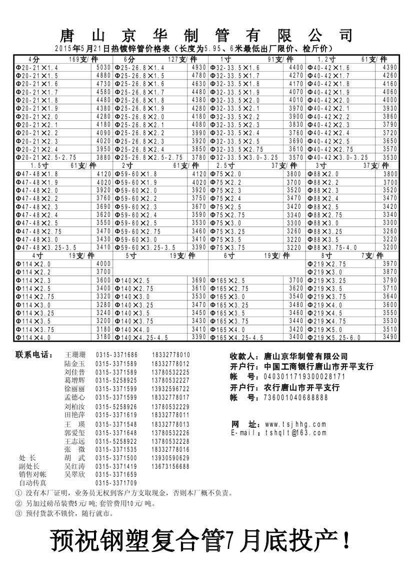 唐山京华2015年5月21日热镀锌管价格表(长度为5.95、6米最低出厂限价、检斤价)