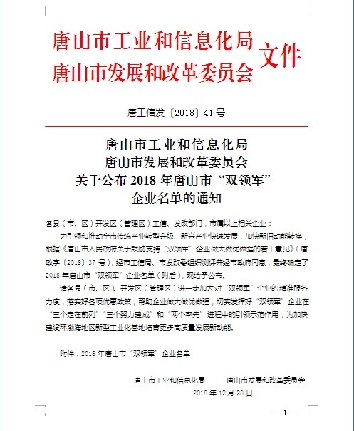 唐山京华获评2018年度唐山市传统行业转型升级领军企业